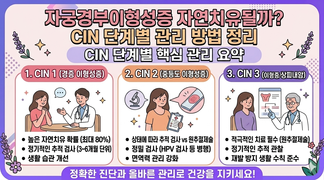 자궁경부이형성증 자연치유 가능성은 단계에 따라 다르고, 특히 CIN 1과 CIN 2·3는 접근이 달라요.